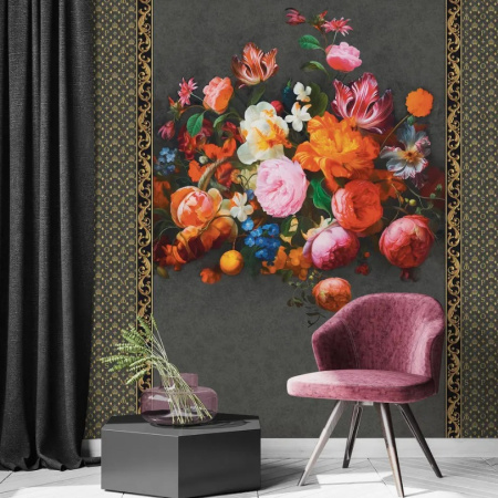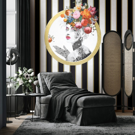 — панно с ярким чёрно-белым женским портретом, украшенным красочным букетом в золотой раме. В качестве компаньонов выступают обои с традиционной широкой полосой;